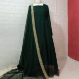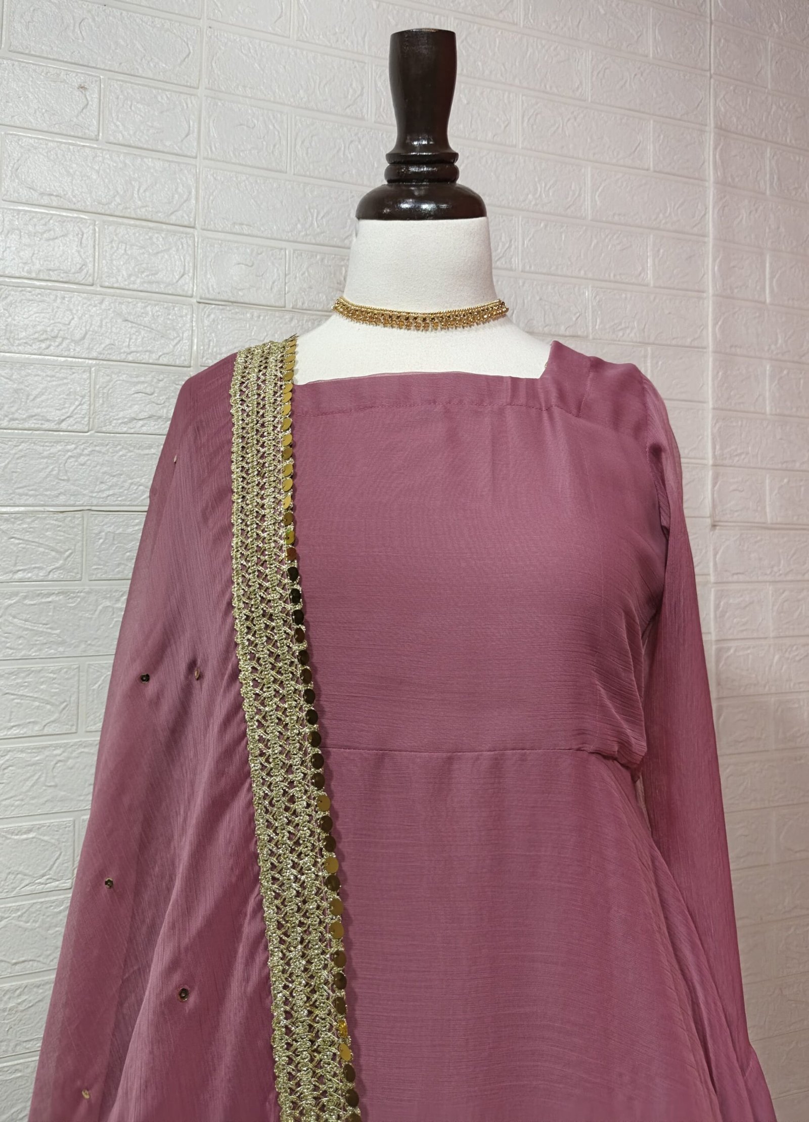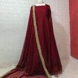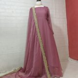 This two-piece anarkali set is made for occasions where you want a graceful and timeless look. The maxi is stitched in crinkle chiffon with an attached malai inner for comfort. It has a wide flair for a fuller silhouette and features detailed back tassels. The dupatta is finished with heavy coin lace and sequence chann, giving the outfit a festive touch. The overall design keeps the look elegant while still making a strong style statement.