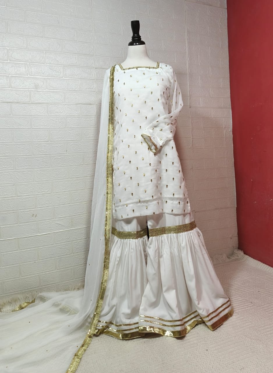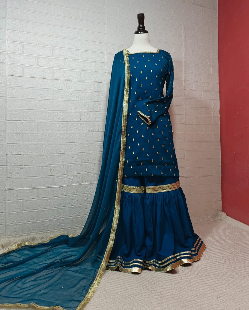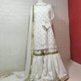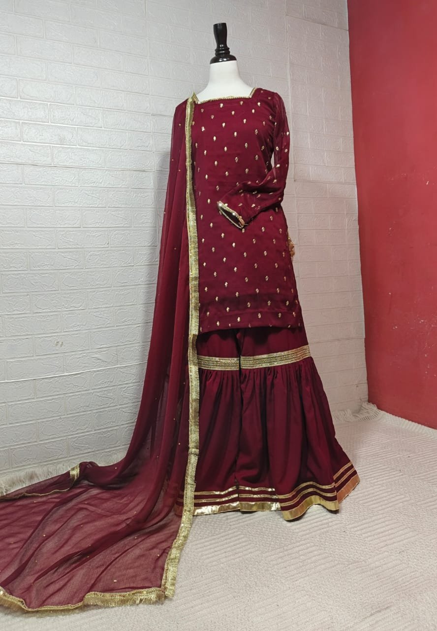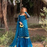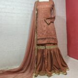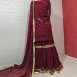 This embroidered 3-piece gharara set is designed for festive events and family occasions. The shirt is fully embroidered on both the front and back for a balanced look. The dupatta is finished with high-quality kiran lace. The gharara is made from malai fabric and decorated with gotta laces, with added tassels on both sides for a traditional touch. Each piece is stitched with care to offer comfort and style.