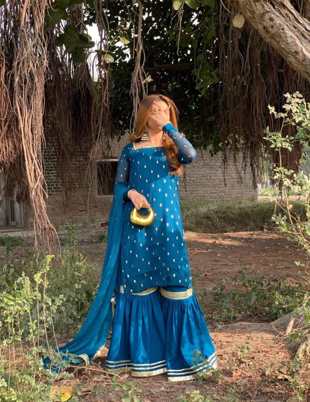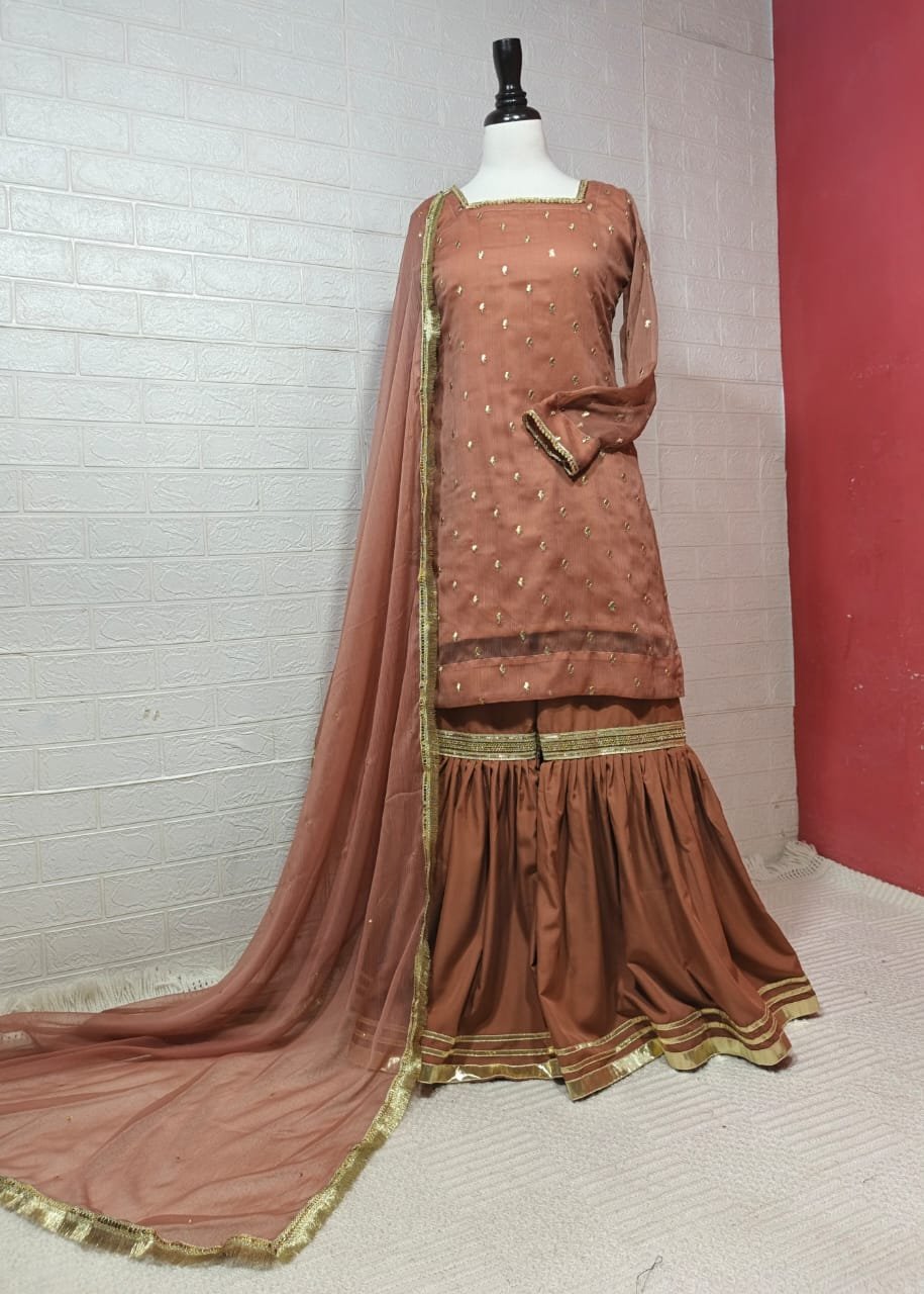 A ready-to-wear embroidered 3-piece gharara set featuring detailed work on the shirt, embellished dupatta and malai gharara.