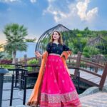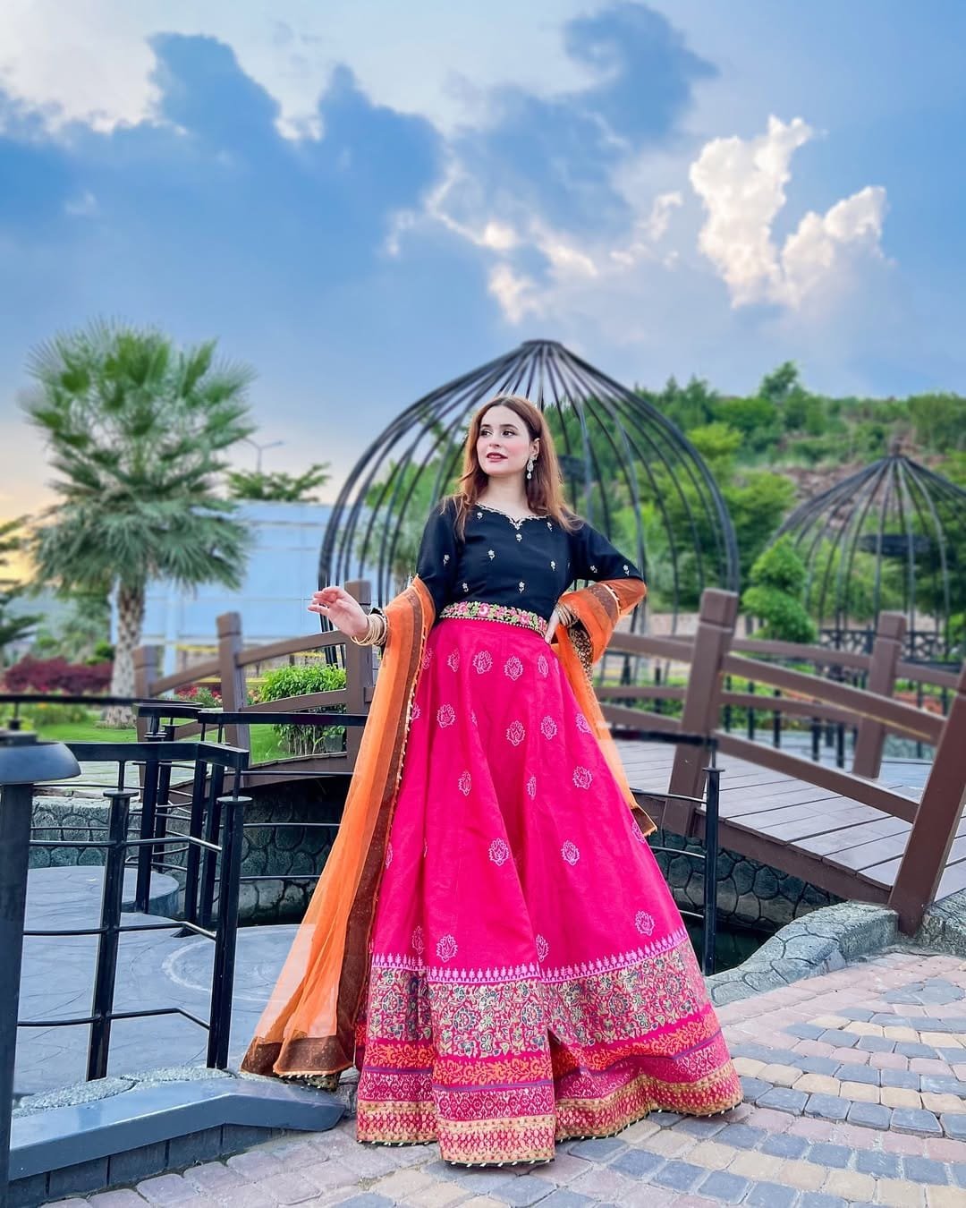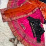 This elegant three-piece set is designed for festive and formal occasions. The shirt is detailed with fine embroidery that adds a refined touch. It is paired with a printed lehenga crafted with a wide 300-inch flair, giving the outfit a graceful and flowing silhouette. The look is completed with a dupatta finished with borders on all four sides, bringing balance and polish to the overall design. Made from silk, the outfit offers both comfort and a rich finish.