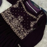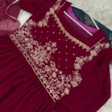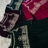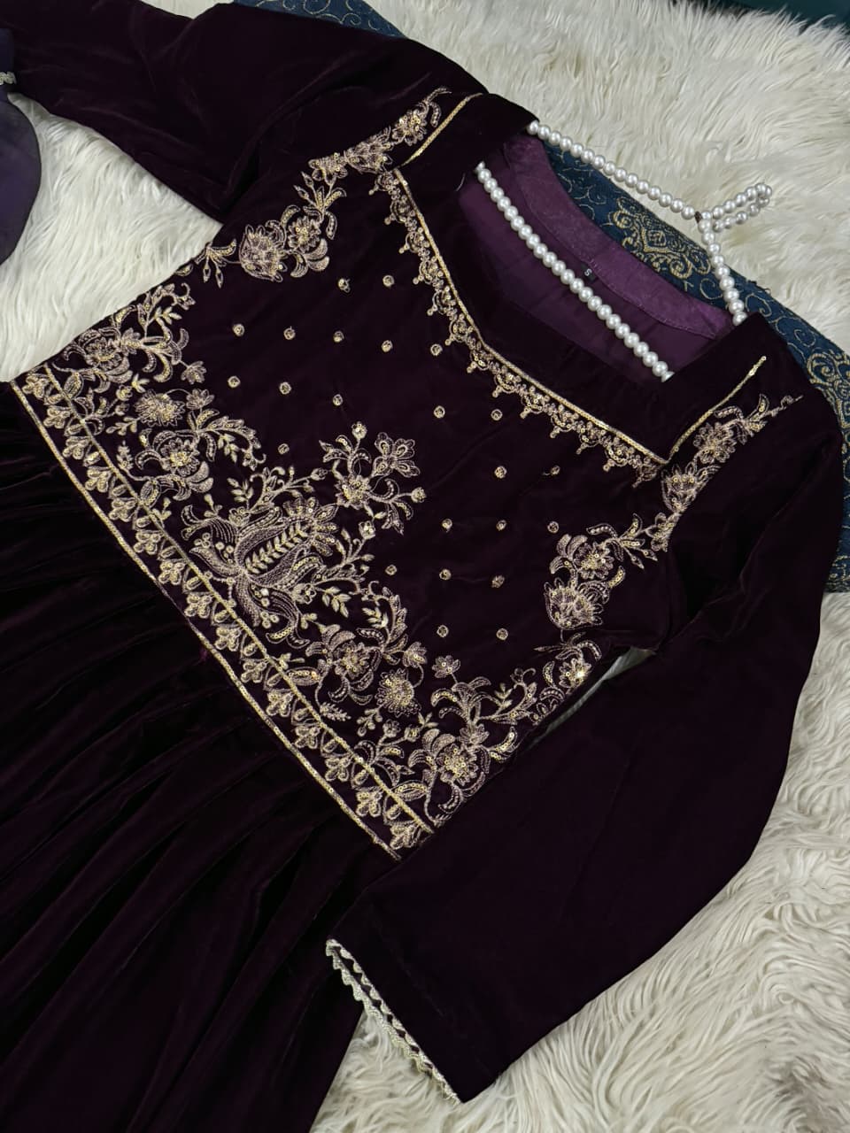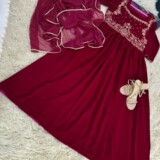 Make a statement with our Micro Velvet Maxi Dress, crafted from premium 11000 micro velvet fabric. The dress features exquisite sequins tilla embroidery and comes with a chiffon dupatta adorned with lace embellishments for a luxurious finish. The flowing maxi design with a flair of 100+ inches ensures a regal and elegant look, ideal for weddings, parties, and festive events.