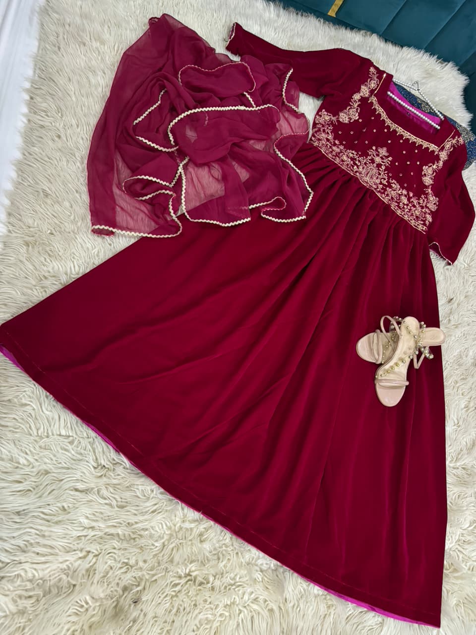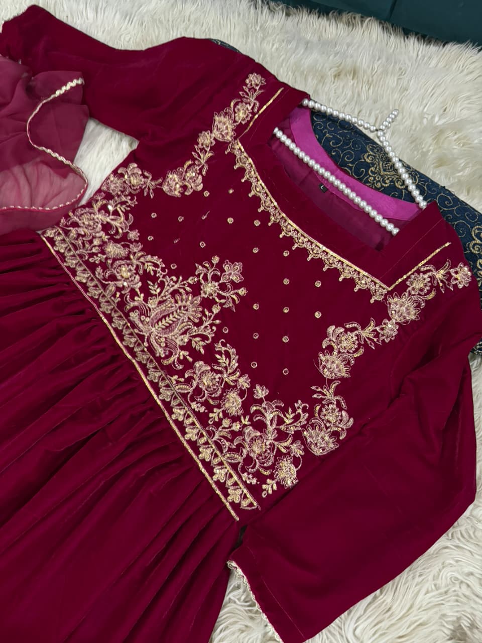 Micro Velvet Maxi Dress with Sequins Tilla Embroidered Chiffon Dupatta