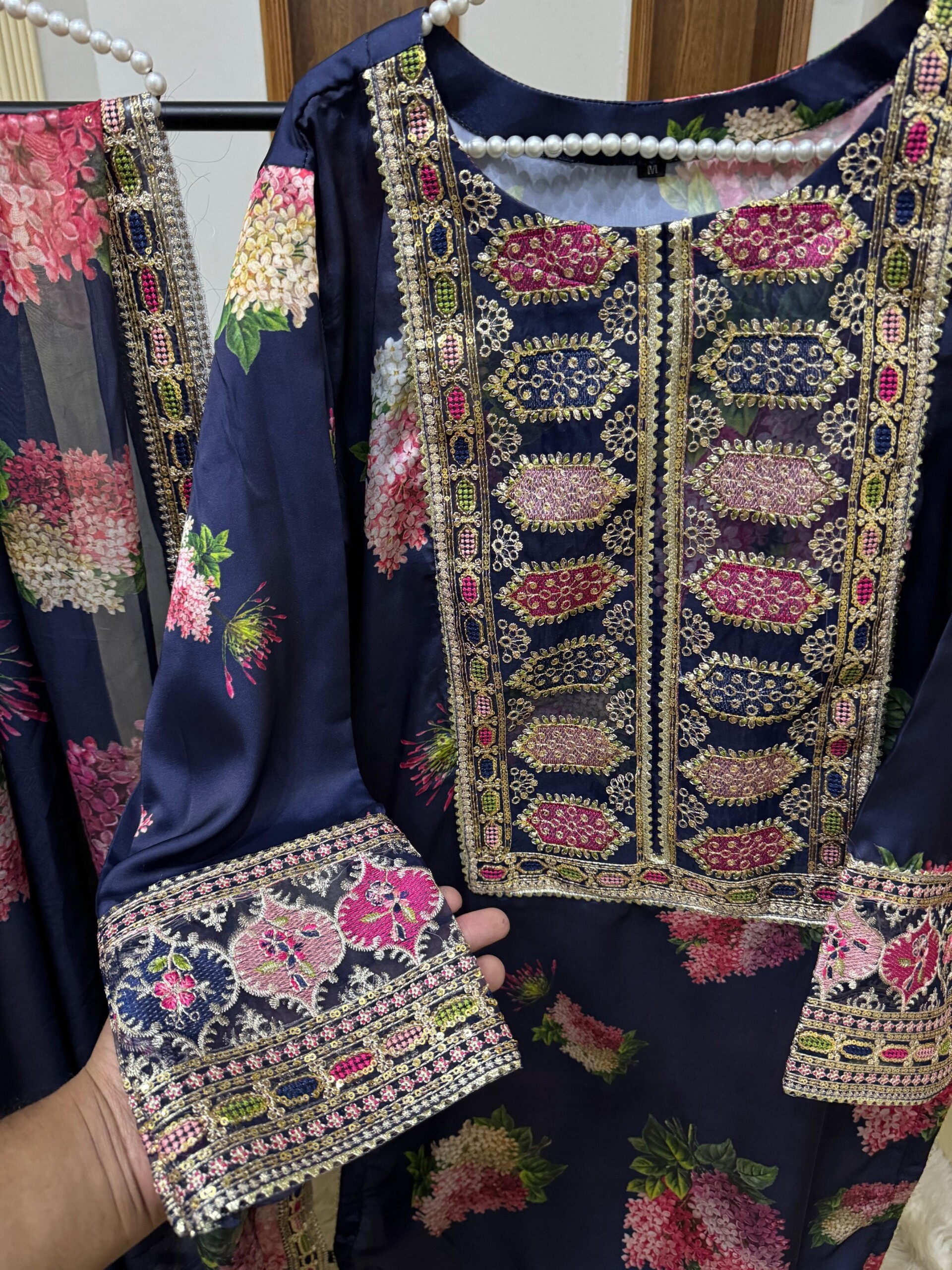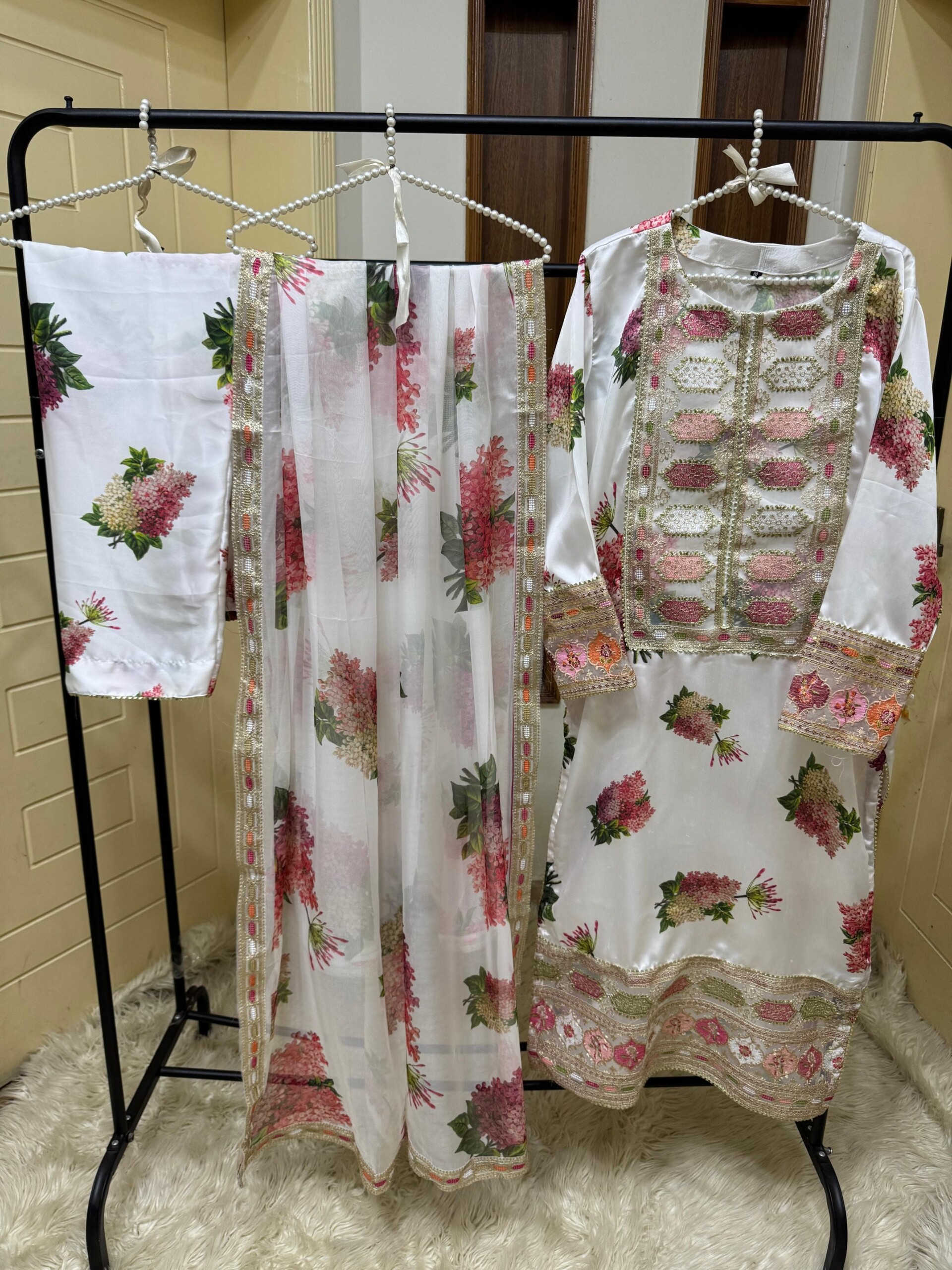 Elegant 3-piece silk set with heavy sequin embroidery, lace detailing, silk printed trouser, and silk dupatta with four-sided embroidery. Perfect for party wear and festive occasions.
