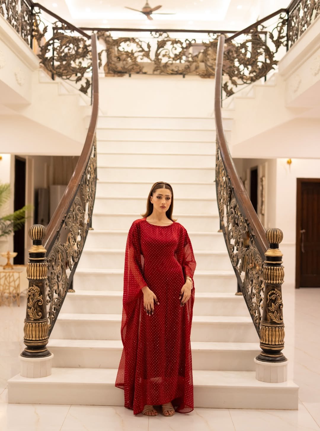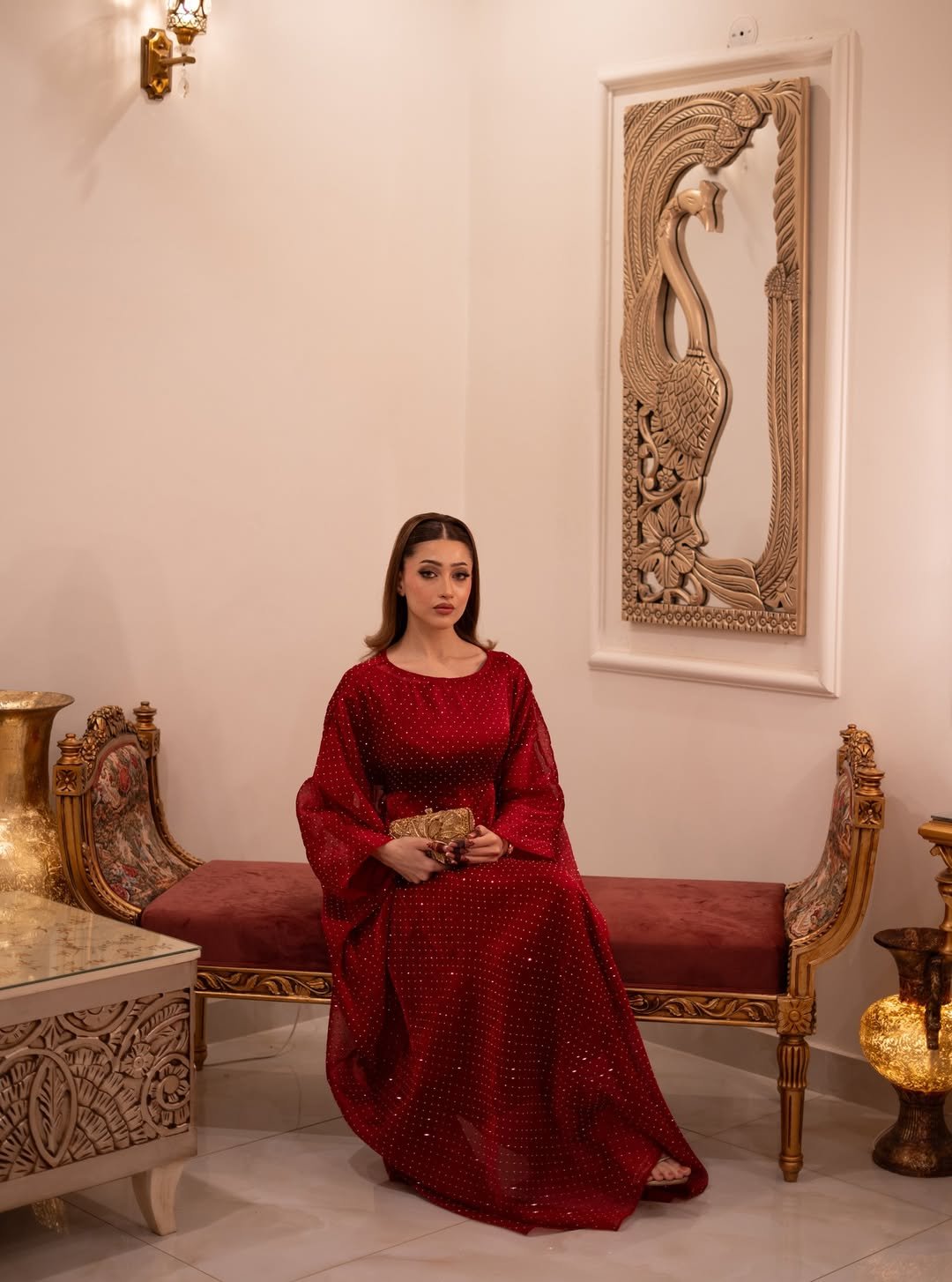 A luxury Arabic butterfly kaftan crafted from shisha silk with stone work, featuring a waist belt and optional inner. Restocked in all colors.