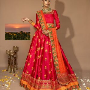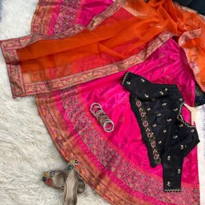 Designer Silk Shirt with Flared Lehenga & Border Dupatta